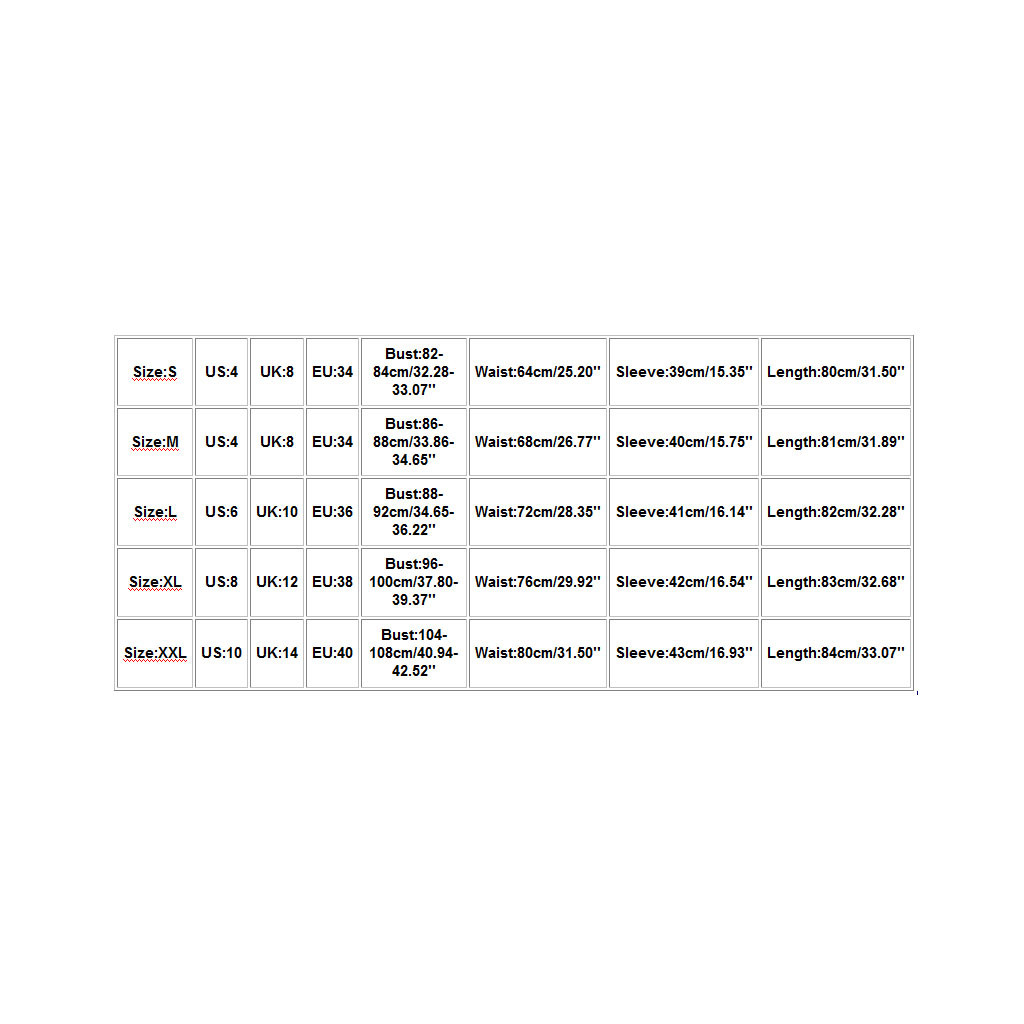 | Size | US | UK | EU | Bust | Waist | Sleeve | Length |
