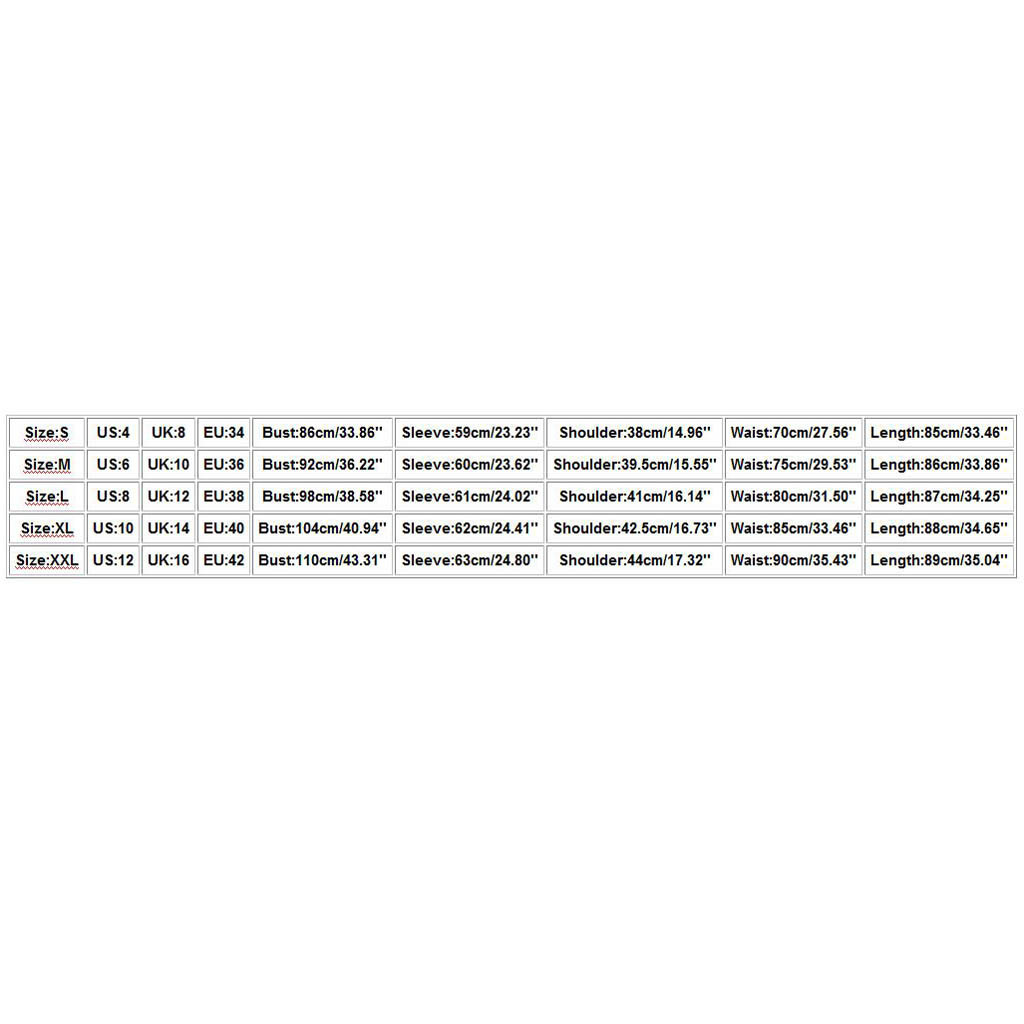 Size US UK EU Bust Sleeve Shoulder Waist Length S 4 8 34 86cm/33.86'' 59cm/23.23'' 38cm/14.96'' 70cm/27.56'' 85cm/33.46'' M 6 10 36 92cm/36.22'' 60cm/23.62'' 39.5cm/15.55'' 75cm/29.53'' 86cm/33.86'' L 8 12 38 98cm/38.58'' 61cm/24.02'' 41cm/16.14'' 80cm/31.50'' 87cm/34.25'' XL 10 14 40 104cm/40.94'' 62cm/24.41'' 42.5cm/16.73'' 85cm/33.46'' 88cm/34.65'' XXL 12 16 42 110cm/43.31'' 63cm/24.80'' 44cm/17.32'' 90cm/35.43'' 89cm/35.04''
