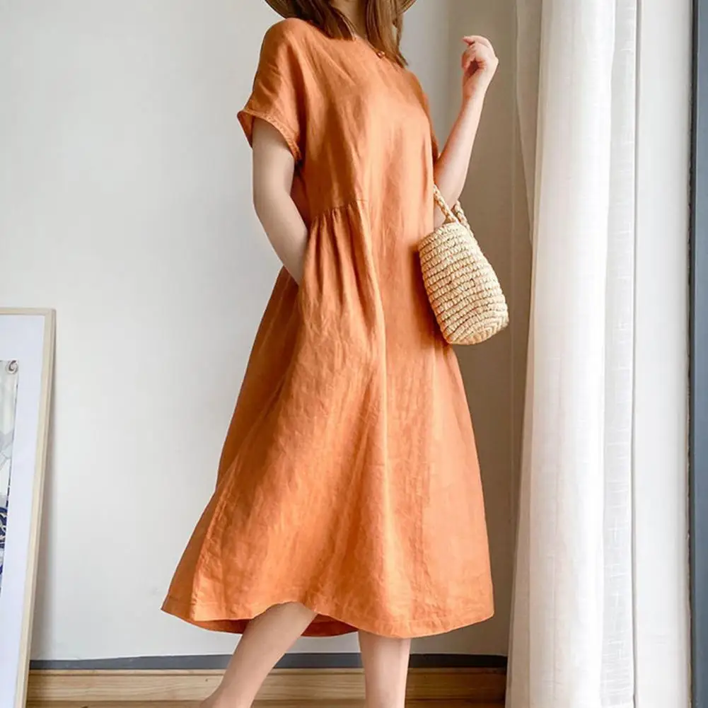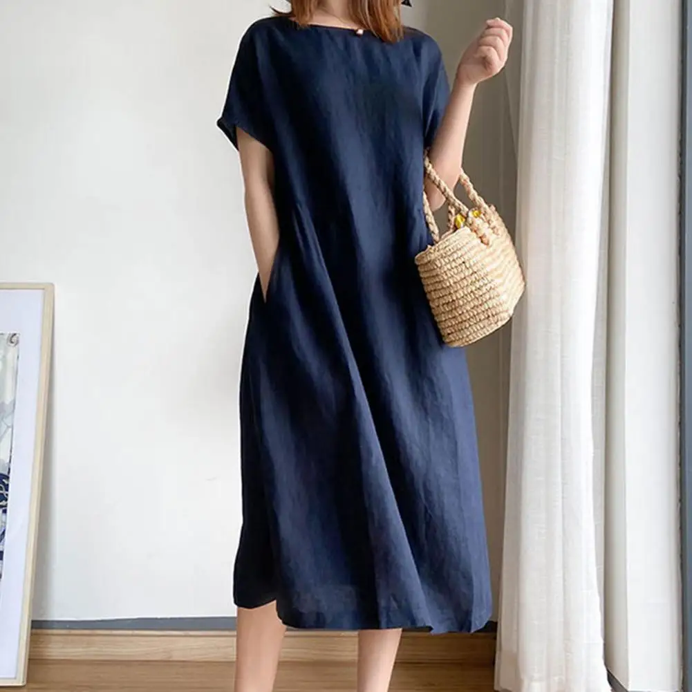 Women Dress Solid Color Large Hem Short Sleeve Pockets Loose Midi Dress for Work