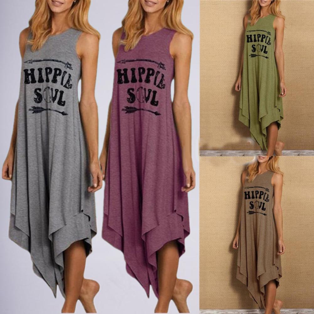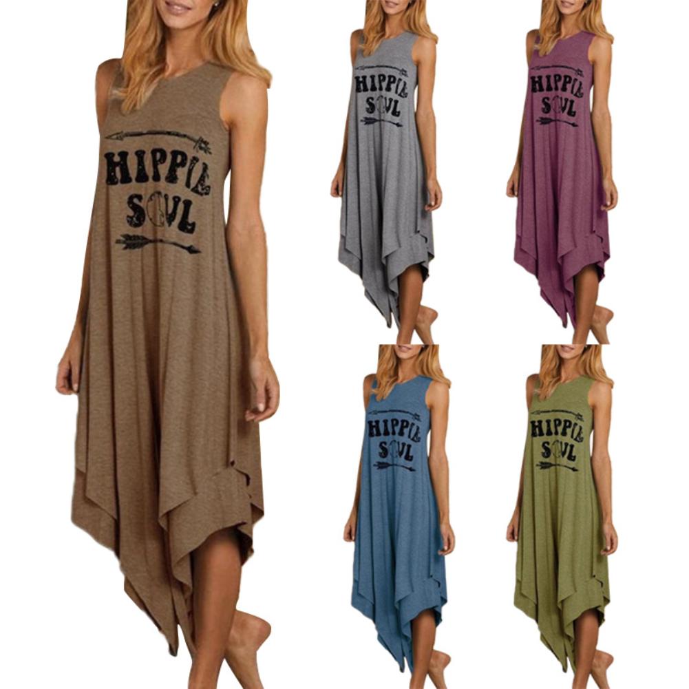 New Women Casual Dress Sleeveless O Neck Arrow HIPPIE SOUL Print Irregular Hem Long Tank Ankle-Length Solid Color Dresses Summer