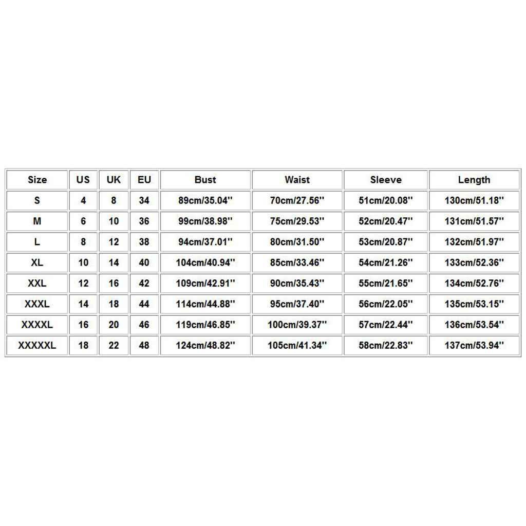 | Size | US | UK | EU | Bust | Waist | Sleeve | Length |