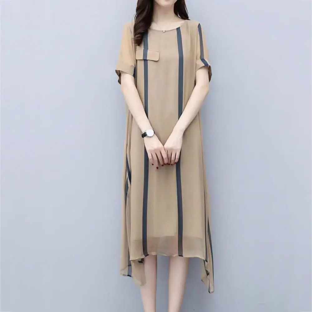 Casual Women Short Sleeve Long Skirts For Women's Dress Korean Style Maxi Skirt O Neck Vertical Stripes Knee-length Party Dress