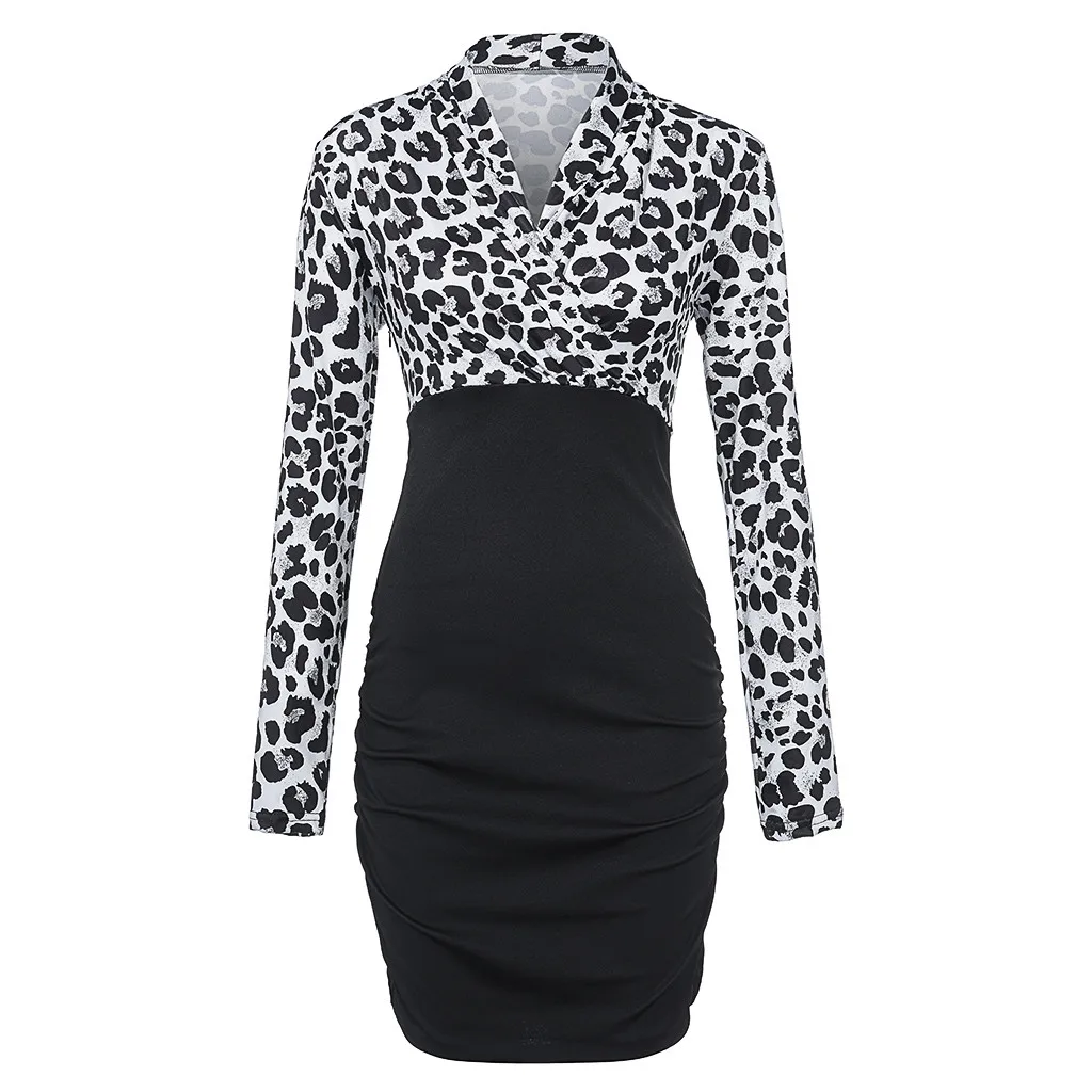 Fashion Women Cross V-Neck Long Sleeve Leopard Print Bodycon Casual Work Dress
