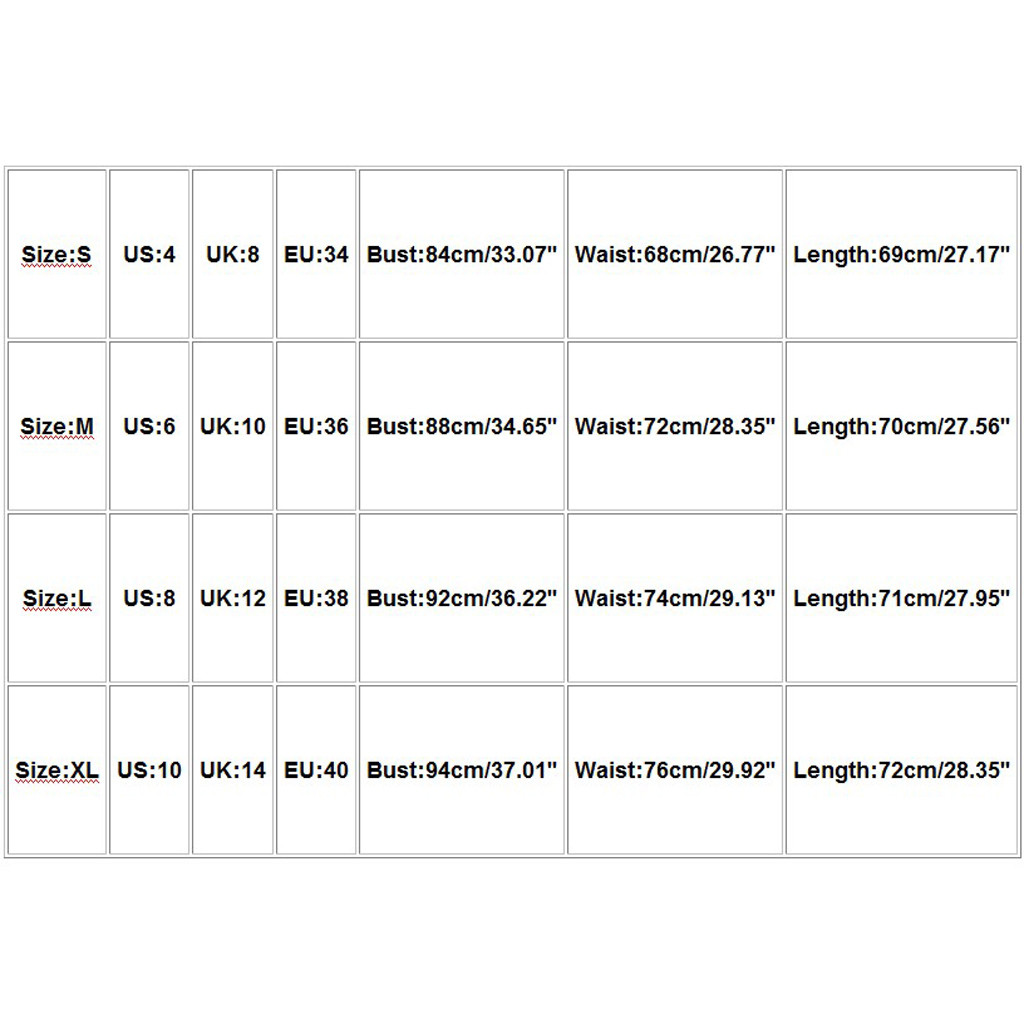 What you get:1PC Women Dress| Size | US | UK | EU | Bust | Waist | Length |