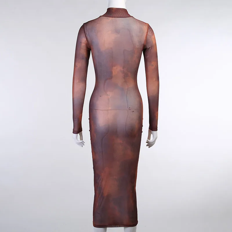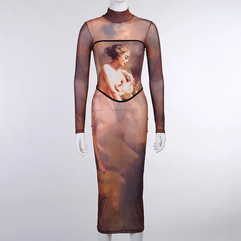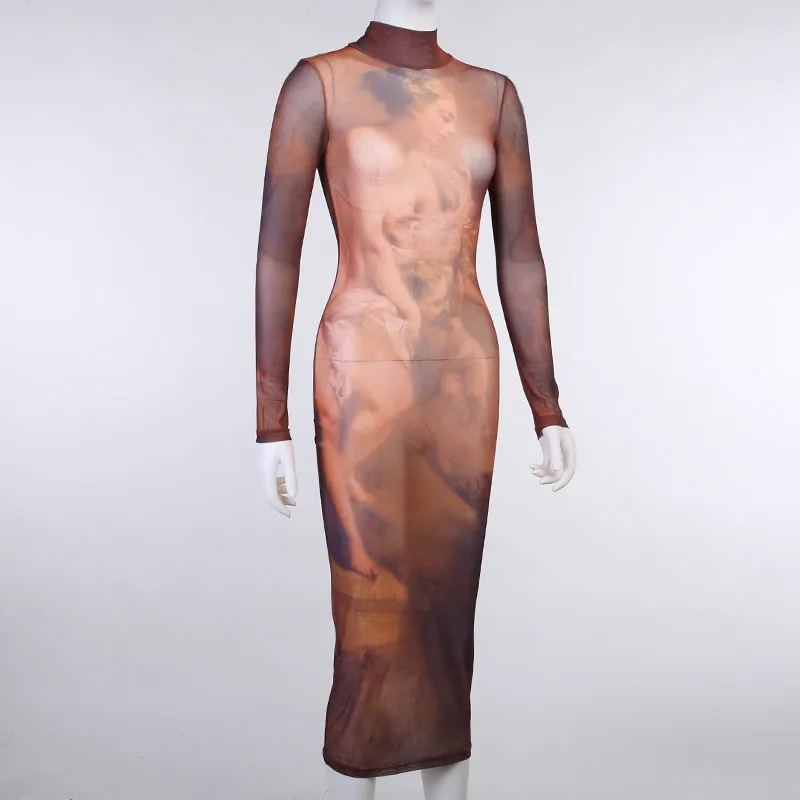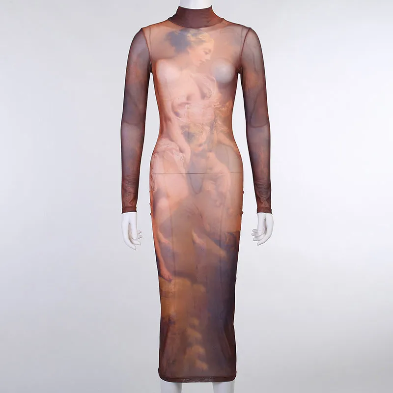 Limited Chance for Hirigin Aesthetic Print Mesh Corset Bodycon Maxi Dresses Long Sleeve Women Sexy Hot See Through Clubwear Party Dress Brown Fall
