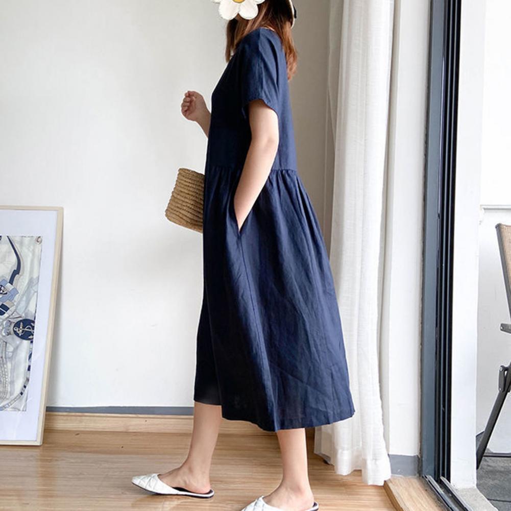 Addition Information of Women Dress Solid Color Large Hem Short Sleeve Pockets Loose Midi Dress for Work