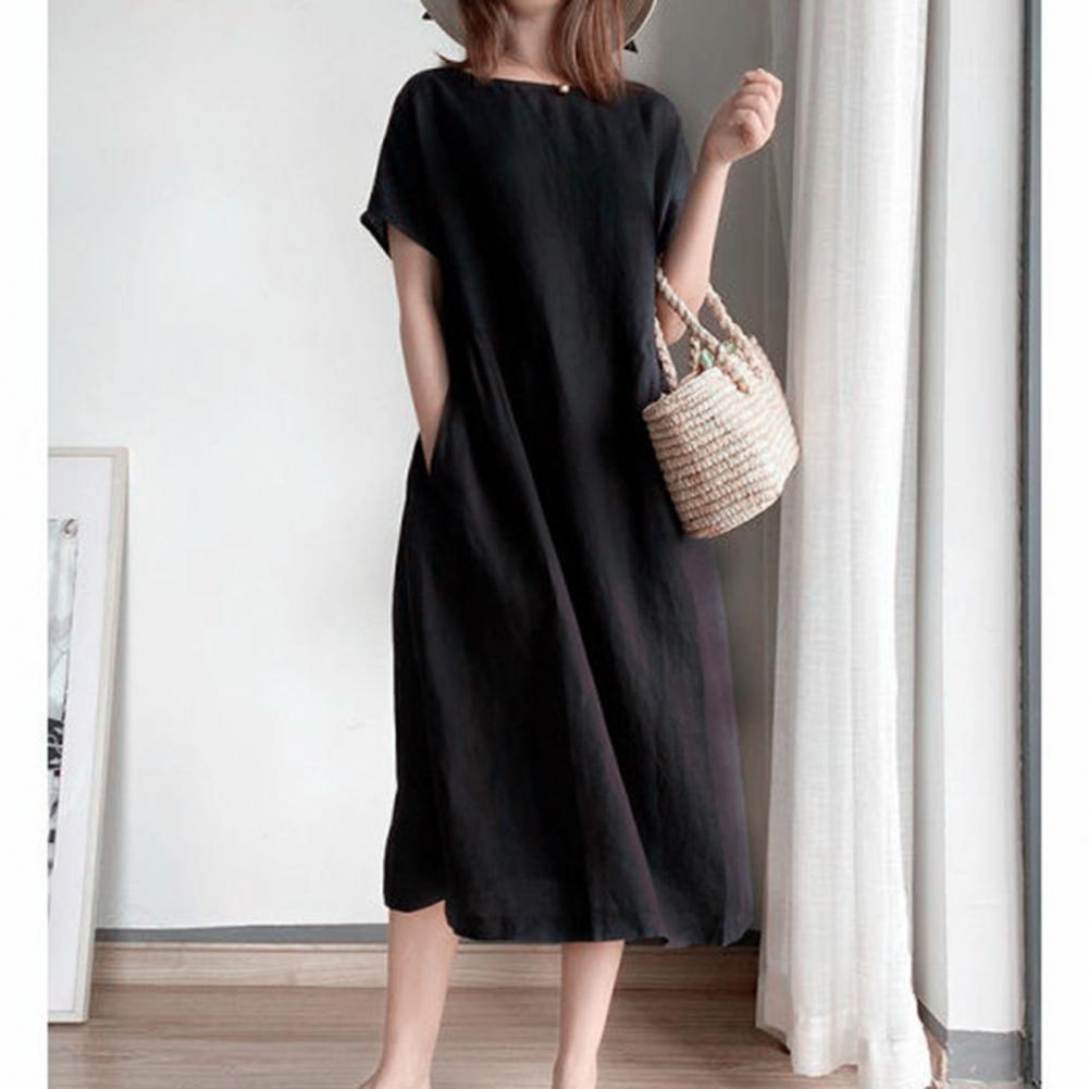 Buy Women Dress Solid Color Large Hem Short Sleeve Pockets Loose Midi Dress for Work Street Wear Summer Black M-4XL платье летнее and You will Save USD 2 or 49% %, Because You Just Pay for 2.08 not Full Price for 4.08