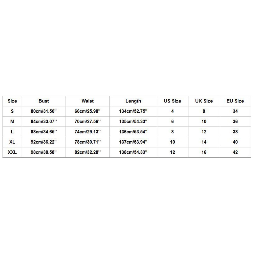 | Size | Bust | Waist | Length | US Size | UK Size | EU Size |