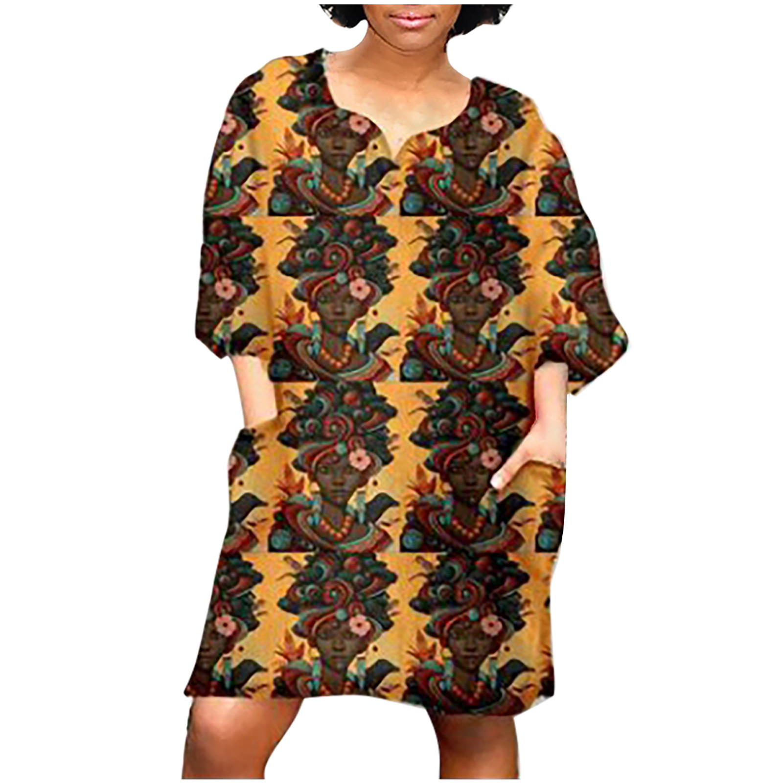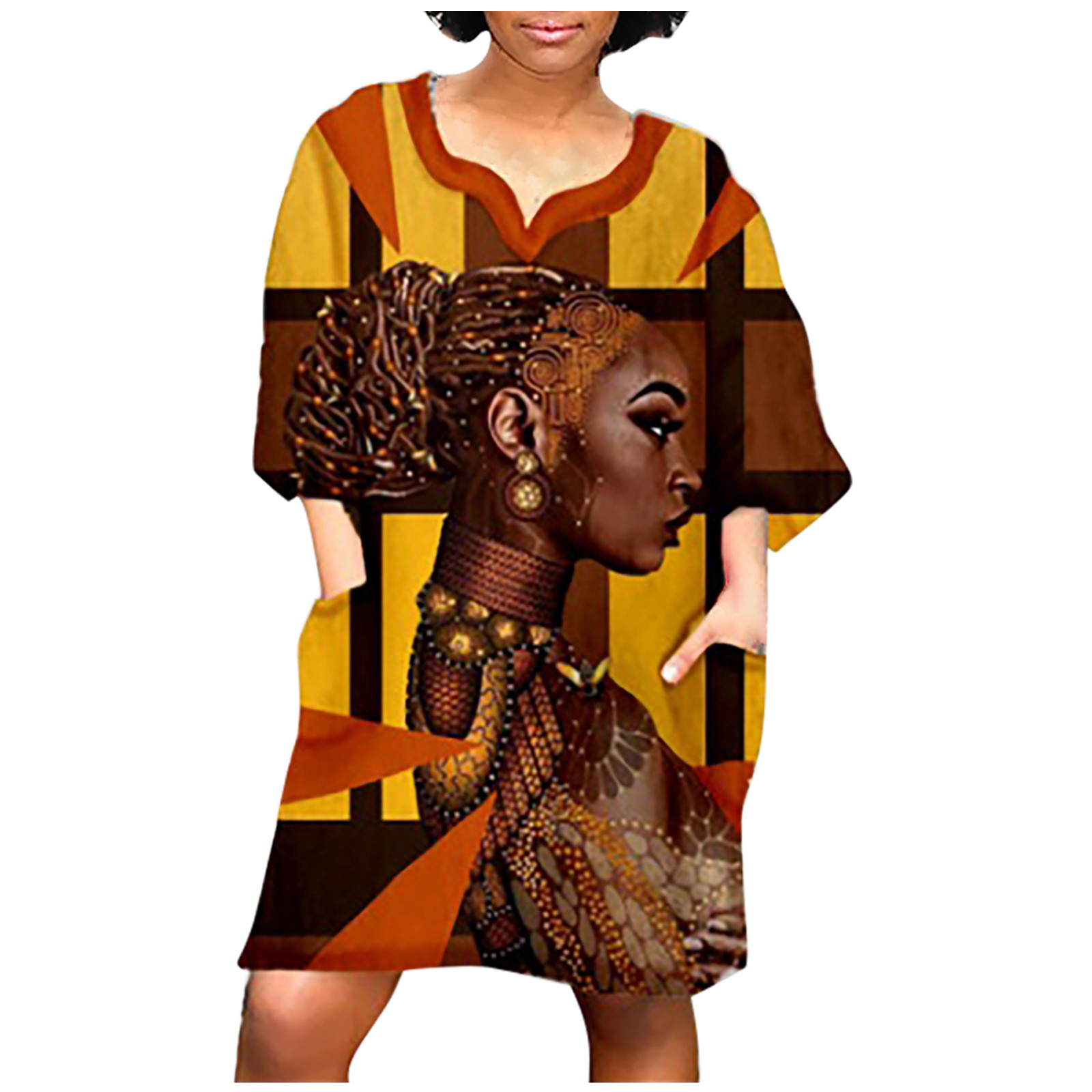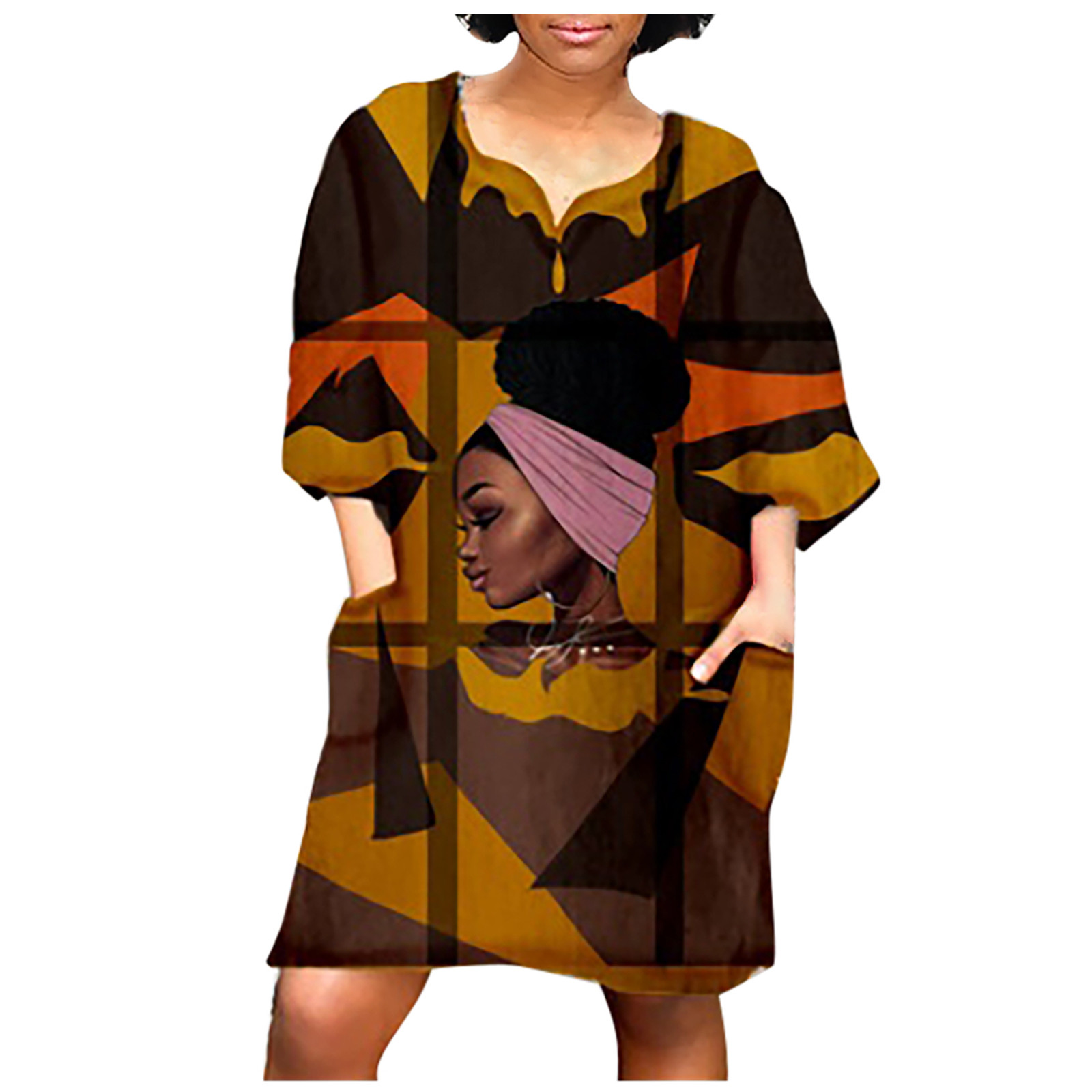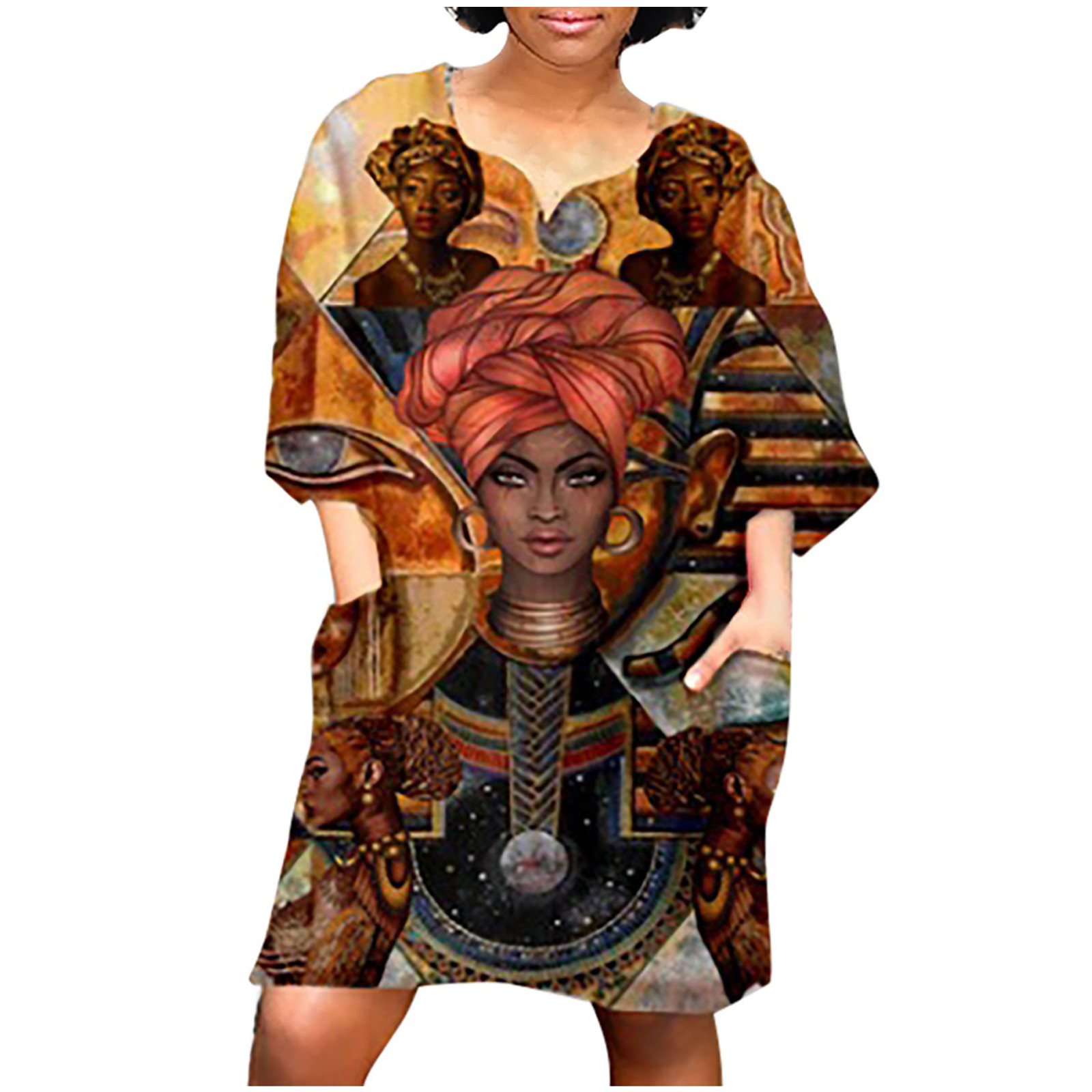 Best Offer for 2021 Fashion Women African Vintage Print Middle Sleeve Dresses Ladies Casual Plus Size V-Neck Loose Mini Dress женское платье