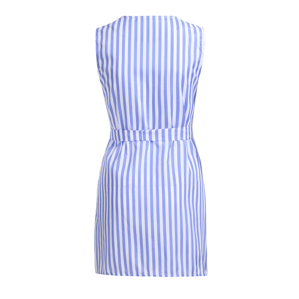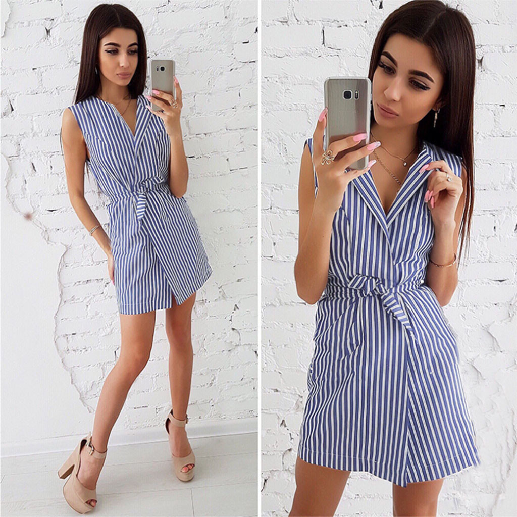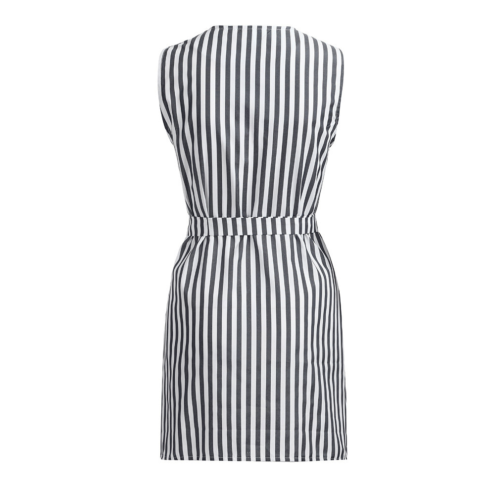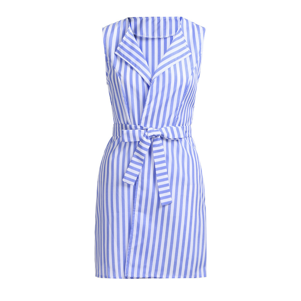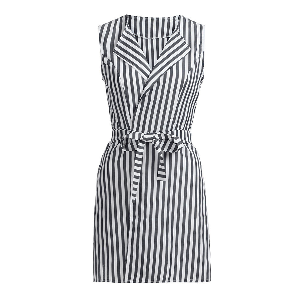 Women Summer Sexy Belt Tie up Work Office Striped Sleeveless Short Mini Dress