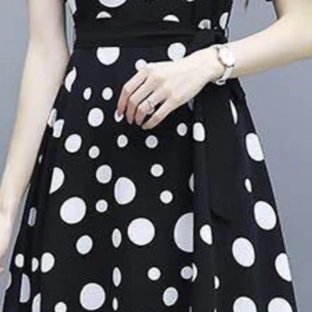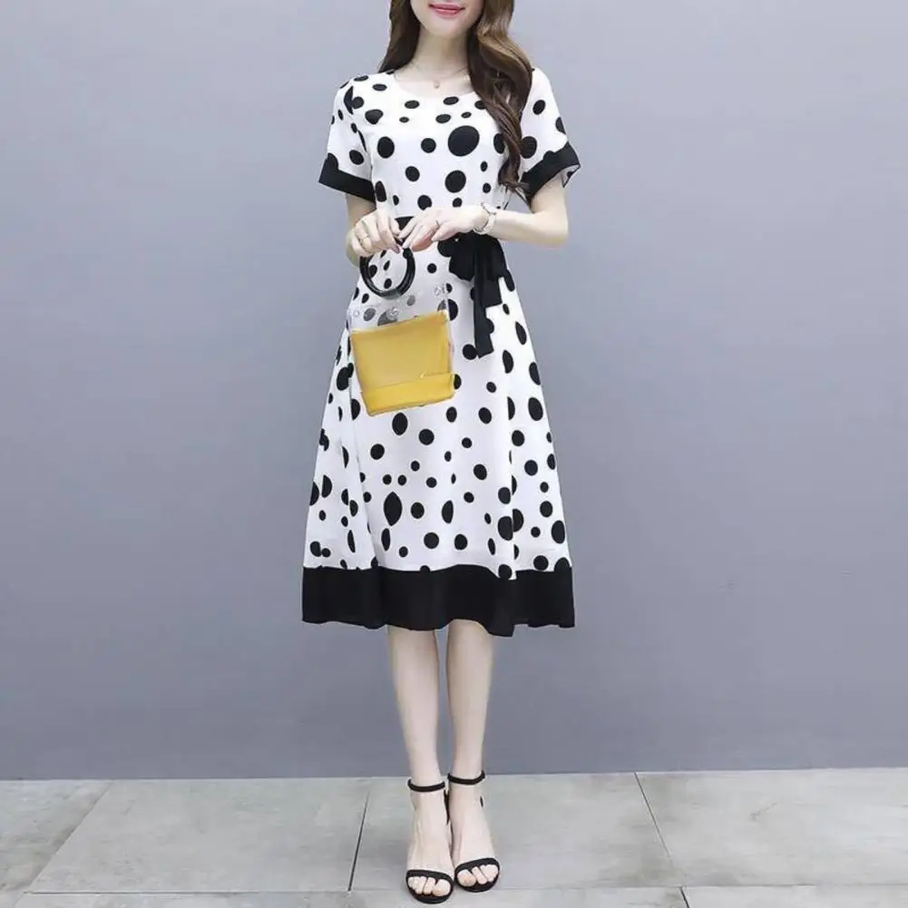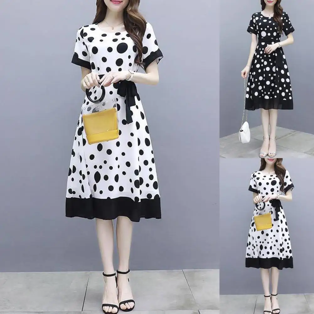 Simple women dress features o-neck, short sleeve, waistband, polka dot, which looks more fashionable and attractive.