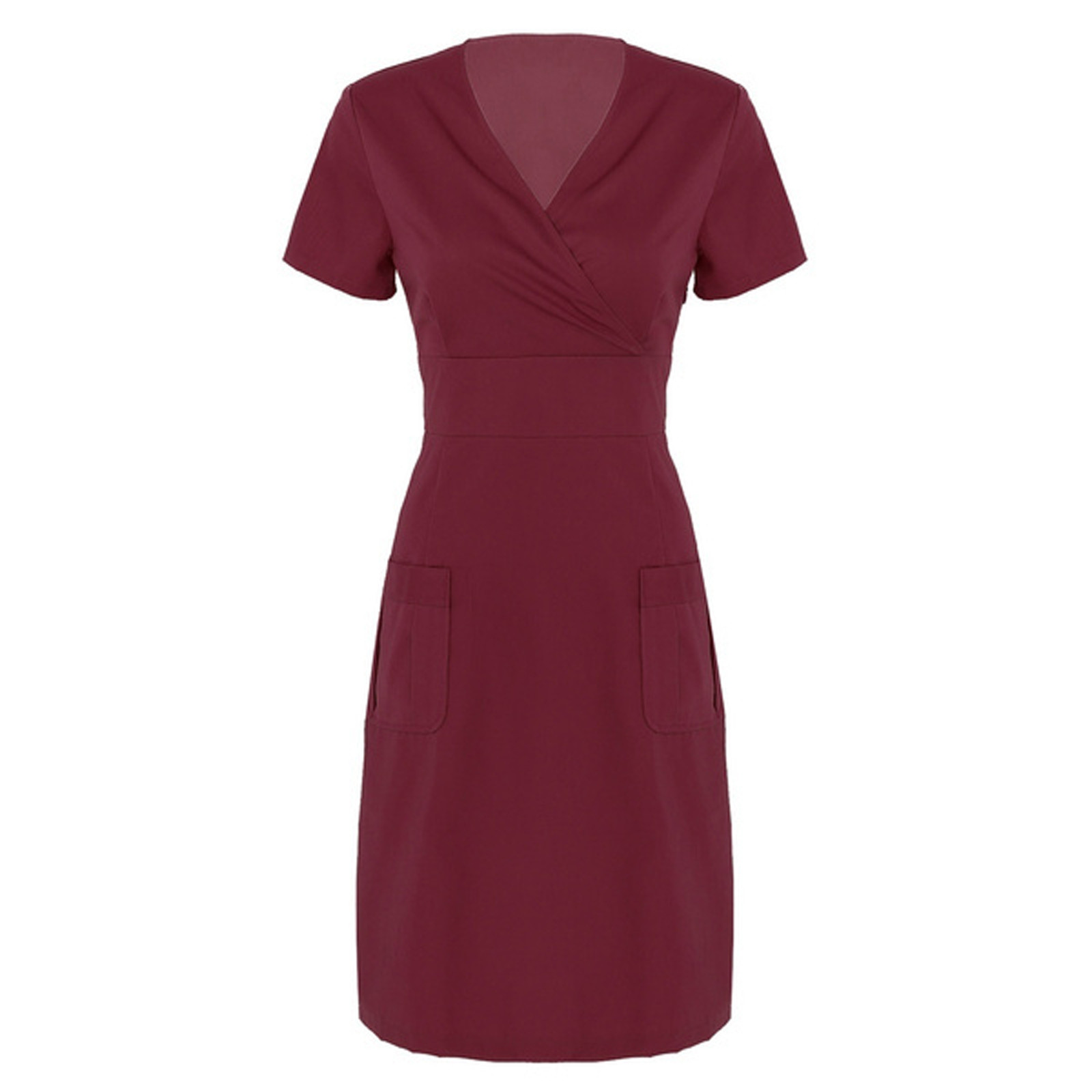 Limited Price of Women Casual Short Sleeve V-neck Solid Working Uniform Solid Pocket Dress