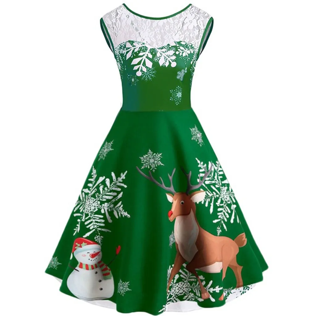 1.Womens Vintage,Christmas, Print,O-Neck,Party, Lace Patchwork,Sleeveless Dress.