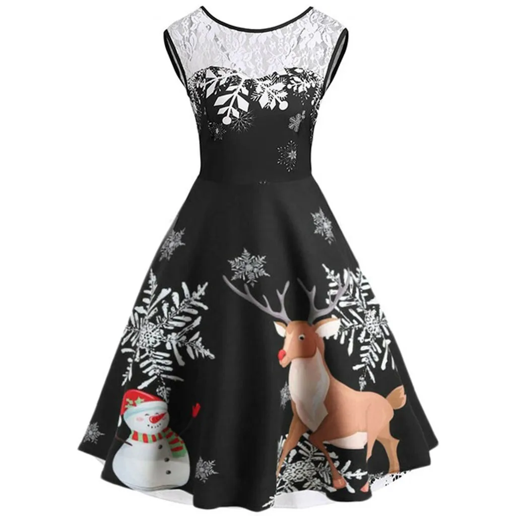 Womens Vintage Christmas Print O-Neck Party Lace Patchwork Sleeveless Dress